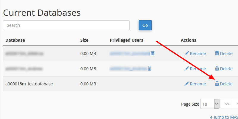 Locate the database name you want to delete, and click the "Delete Database" to confirm.