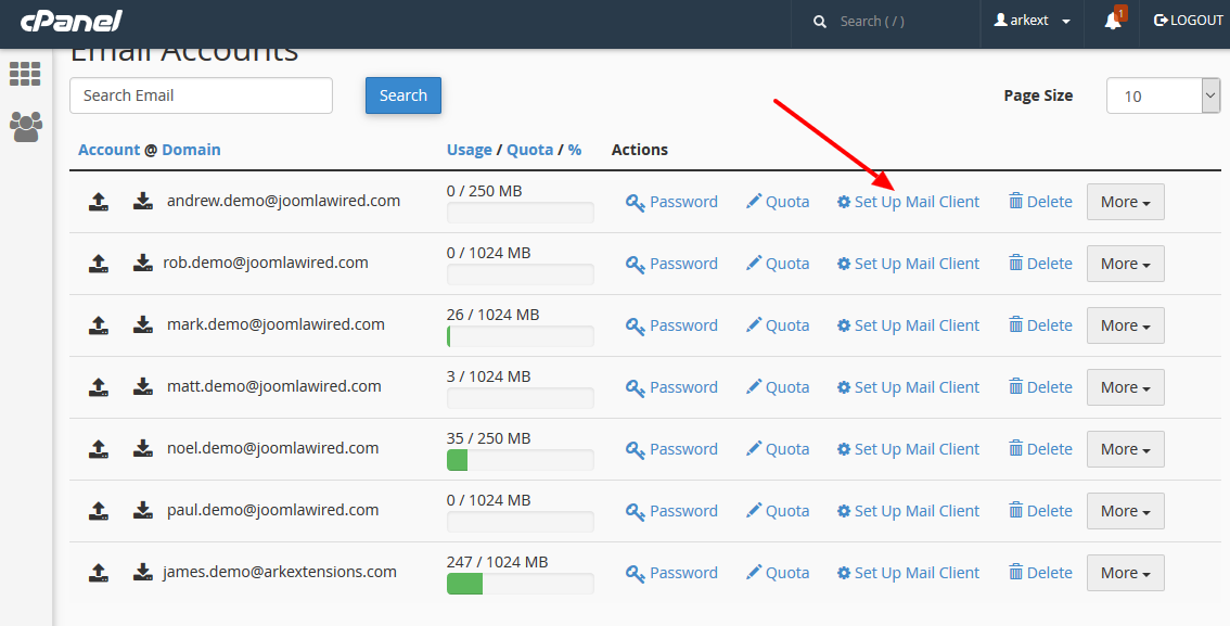 Once on the Email Accounts page, locate the Set Up Mail Client link.