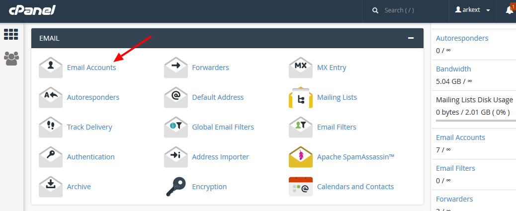 From the cPanel home screen, click on Email Accounts within the Email section of the page.